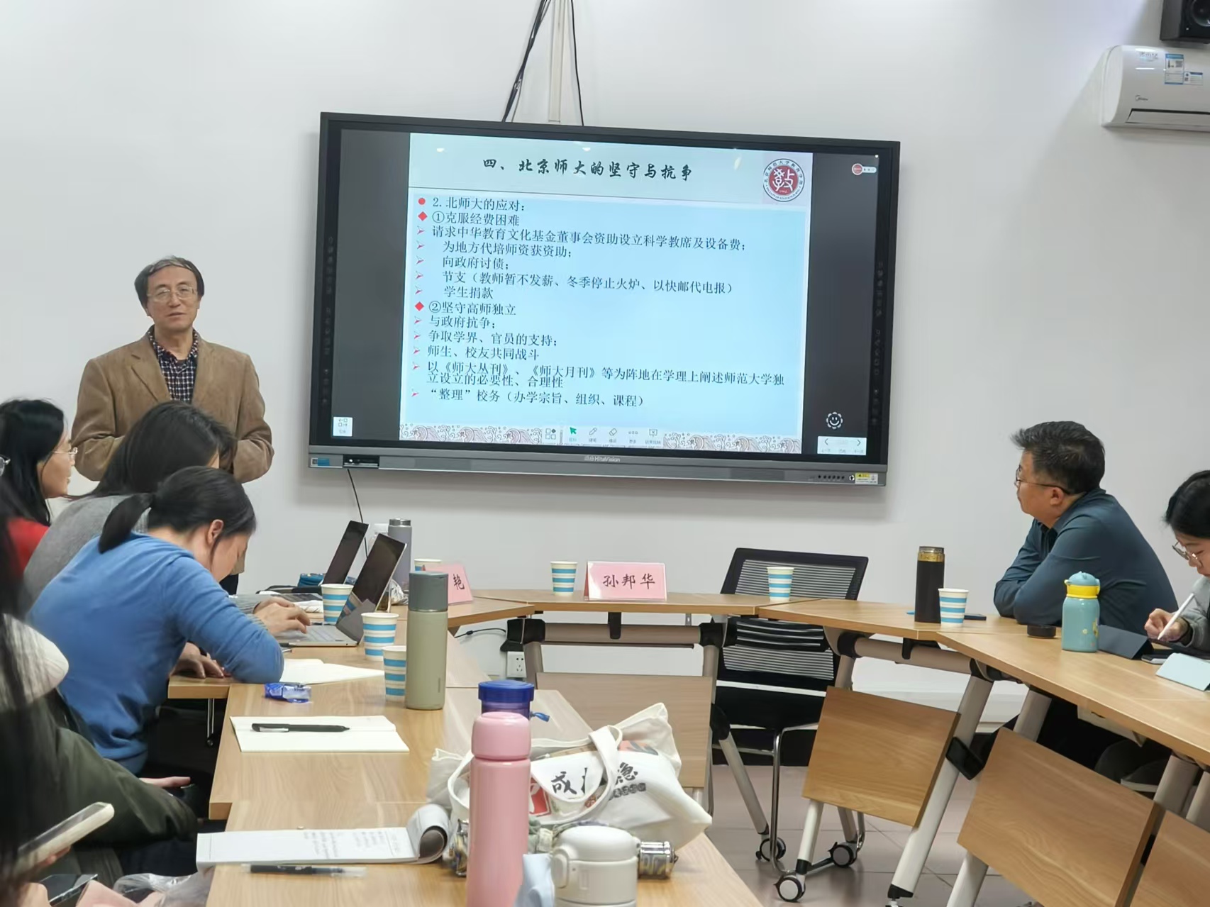 孙教授从“高师何以改大”“高师改大两种模式”“高师改大后之危局”“北京师大的坚守与抗争”四个方面展开讲解。首先,孙教授结合1922年学制改革阐述了高师改大的背景。孙教授指出,学制改革对中学团队提出新的要求,当时教育界在有关中学团队培养上有三派意见,高师改大即为其一。其次,孙教授考察了原教育部直属七所高师的具体改设情形。孙教授指出,高师改大出现了“北京高等师范公司—北京师范大学”与“南京高等师范公司—东南大学”两种模式,至30年代初,北京师范大学成为“硕果仅存”的师范大学。接着,孙教授分别阐述了“改大”之后北京师范大学遭遇的各种危机与应对之策。孙教授指出,20年代至40年代,北京师范大学不断遭遇经费困难、董事长相继辞职、暂停招生、停办、“抗战胜利”后不能复员等危机。北京师范大学师生、员工在极度困难的情况下,进行坚守、抗争,维护了师范大学独立设置的体制,为中国高等师范教育保存了发展的火种。最后,孙教授对高师改大运动作了深入的总结与反思。